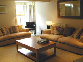 The comfortable sitting room is tastefully furnished - a bay window looks